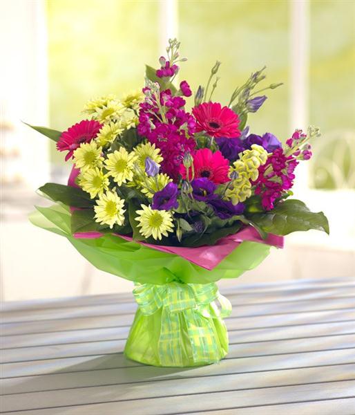A bright bouquet of vibrant summer shades. The cerises, purples and limes of the hydrangeas, lisianthus, chrysanthemums and stocks combine to make this fantasically frangrant arrangement.