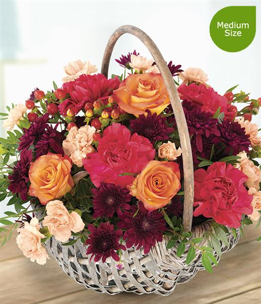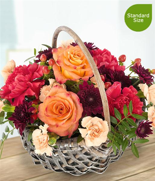 Orange Roses married with orange and cerise Carnations and deep burgundy Spray Chrysanthemums with a generous dash of pretty Hypericum Berries. A simply stunning autumnal flower basket.