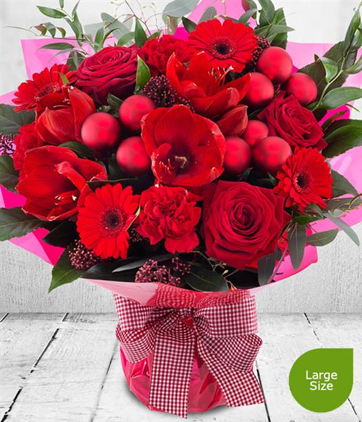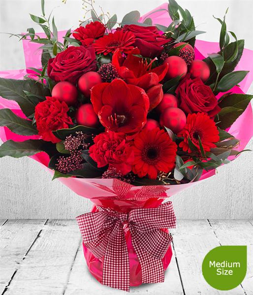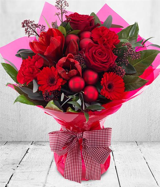 If it has to be red this Christmas then look no further. Roses, Germini and Carnations with baubles and bows create this gloriously bright red Aqua-pack Bouquet. It's quite simply the perfect Christmas gift.
