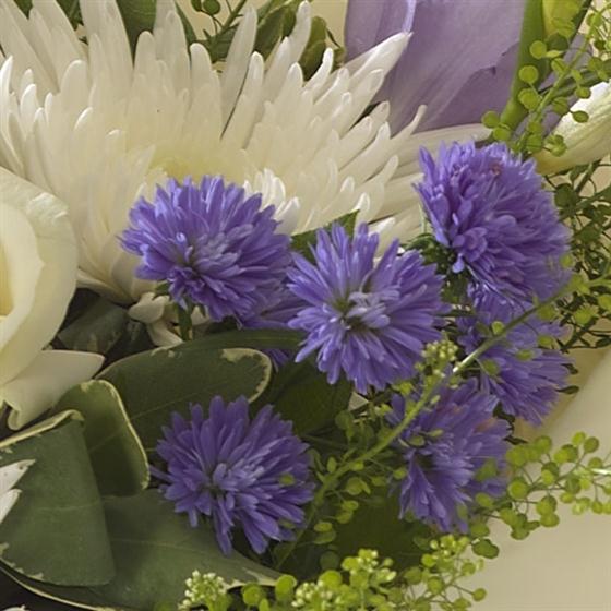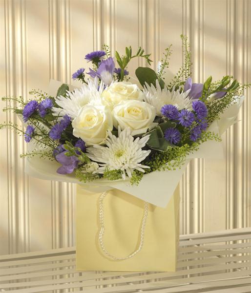 A perfect welcome for the birth of a baby boy. This beautiful hand-tied bouquet features Roses, fragrant Freesia, bloom Chrysanthemums and Aster. Delivered in an aqua pack presentation bag.