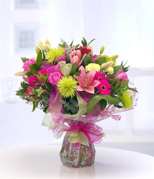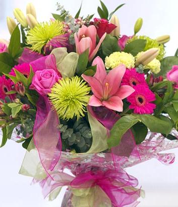 Pink and green handtied bouquet delivered in water with shamrock blooms, pink lilies, bouvardia, deep pink alstromeria, green carnations and pink roses.