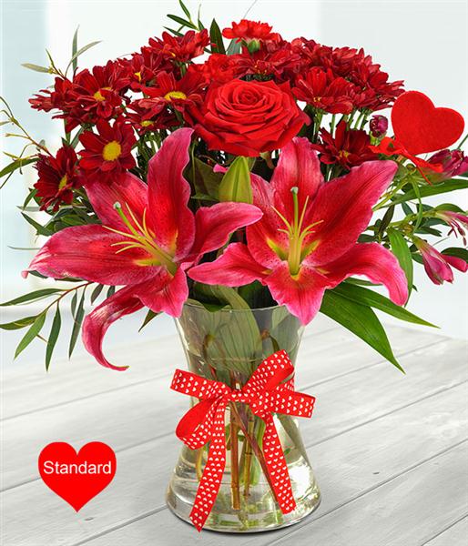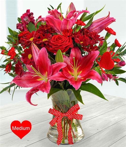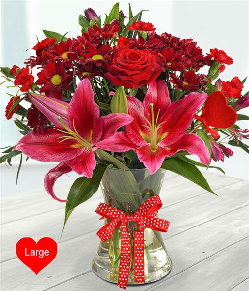 A simply gorgeous Valentine's Day flower bouquet. Red Roses, Carnations and Chrysanthemums zing alongside pretty pink Lilies and cerise Alstroemeria. A touch of Eucalyptus completes this beautiful gift.