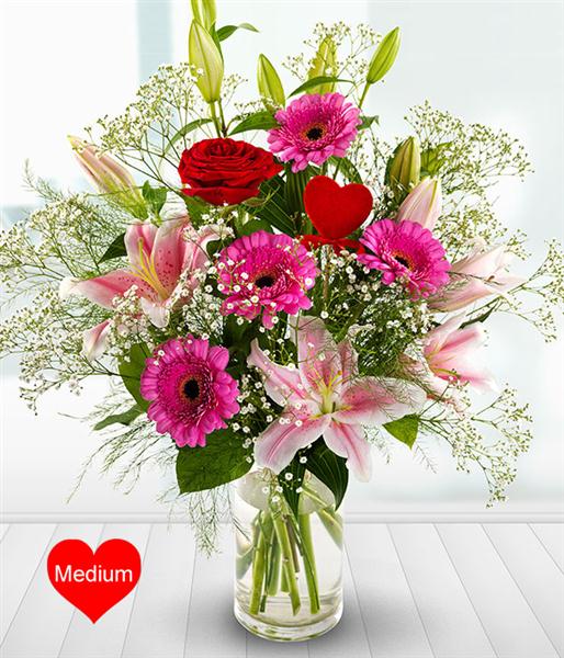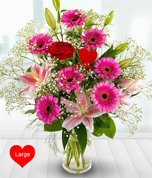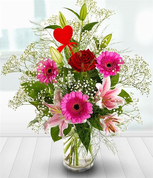 A pretty pink Valentine's Day Vase Arrangement of Lilies and Germini. With a single red Rose and a big heart at the centre, this Vase Arrangement says it all.