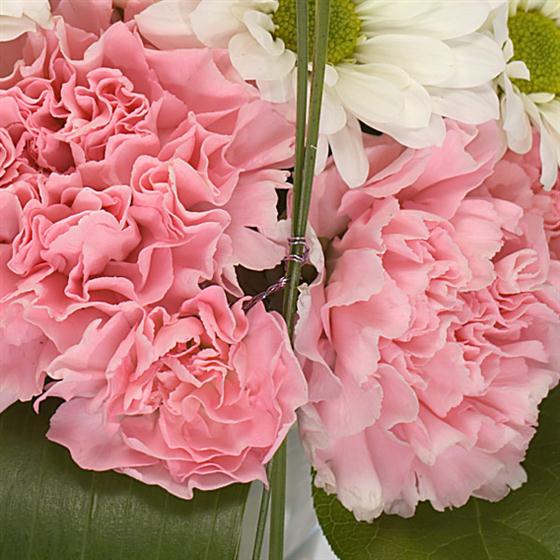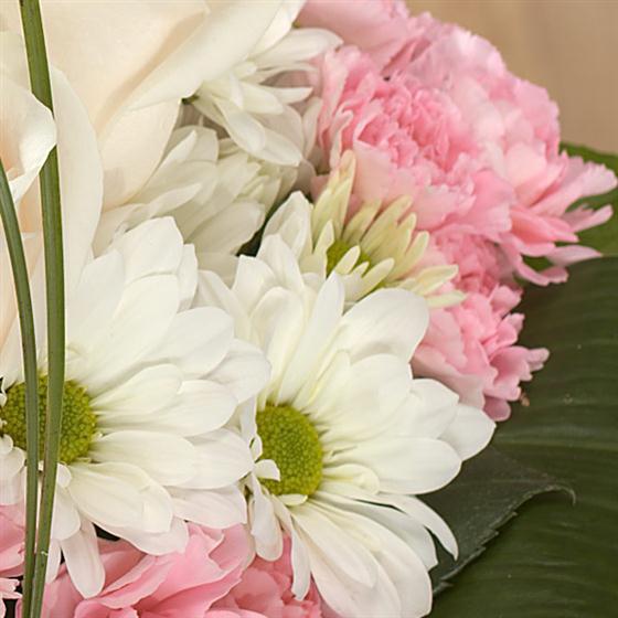 A classic Biedermeier hand-tied of folded Aspidistra leaves which frame groups of pink Roses, Carnations and Chrysanthemums in this delicate hand-tied.