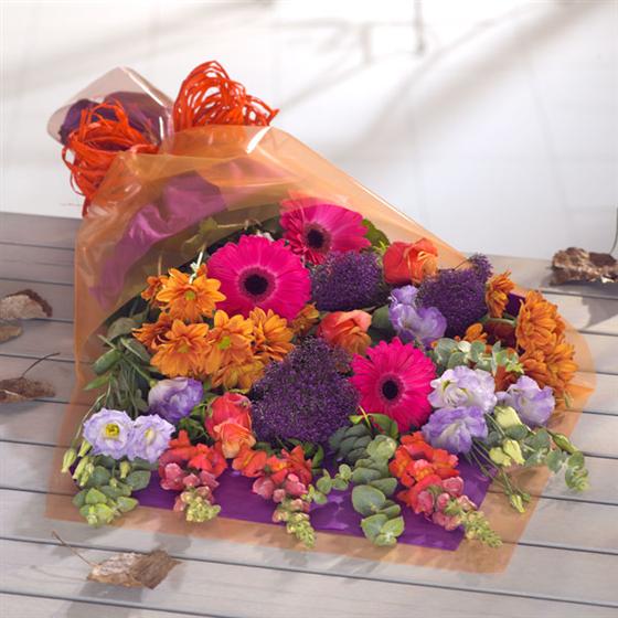 The dramatic cerise Gerberas offset against fiery Roses, Chyrsanthemums and purple Trachelium create this rich flower arrangement.