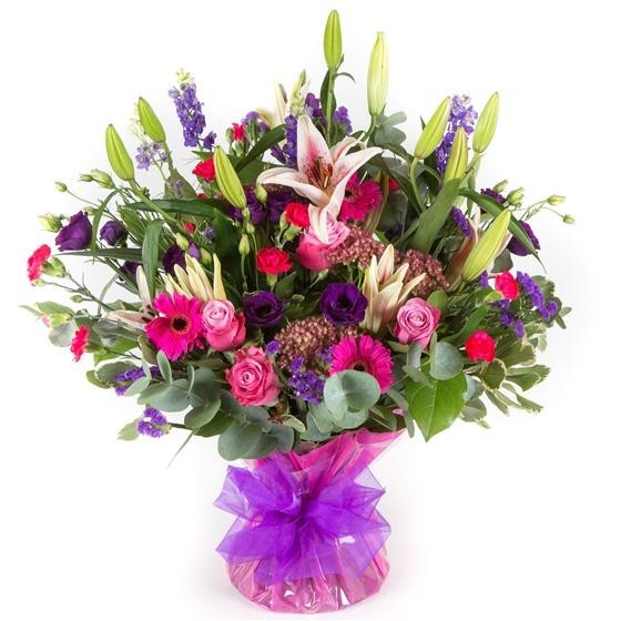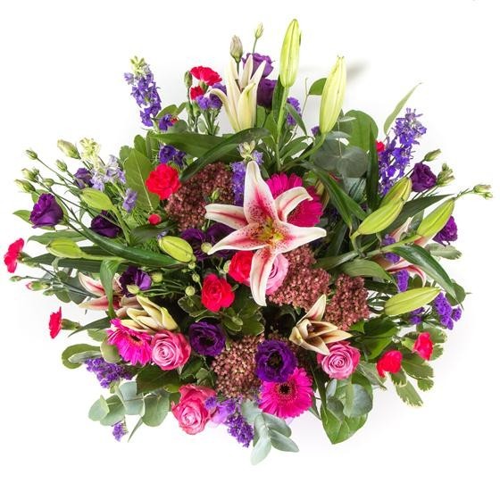 A bold, beautiful bouquet in shades of pink and purple including lilies, roses, and larkspur. A real show stopper!