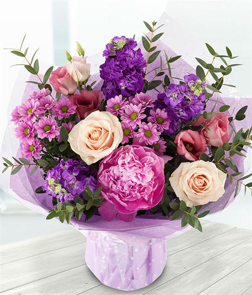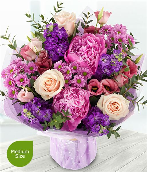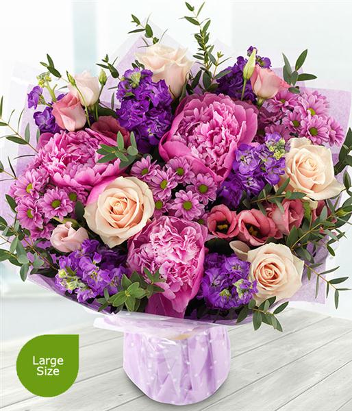 An incredibly gorgeous aqua pack bouquet featuring pink peonies, roses, lisianthus, carnations and purple stocks. A touch of eucalyptus completes the arrangement.