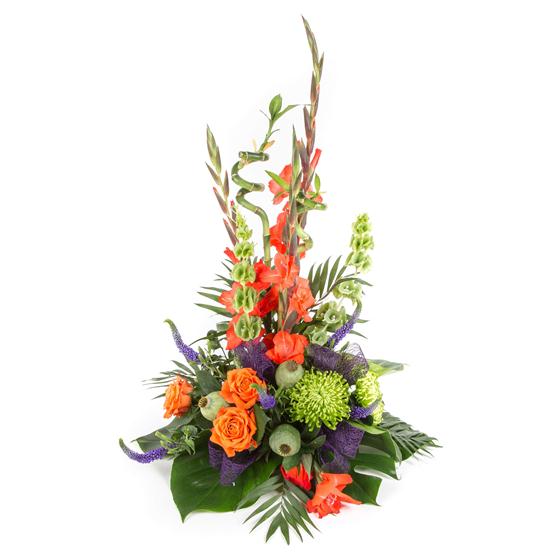 An imposing display of magnificent, contemporary blooms in tropical shades of purple, orange and lime.