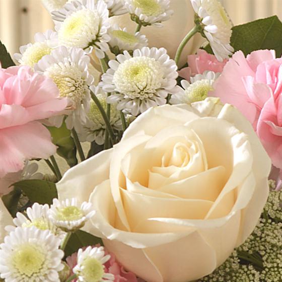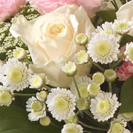 A pretty pink and cream hand-tied bouquet featuring Roses, Carnations, spray Carnations and spray Chrysanthemums. A perfect gift to welcome a baby girl. Delivered in an aqua pack presentation bag.