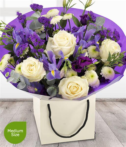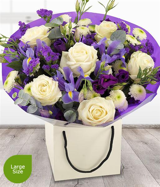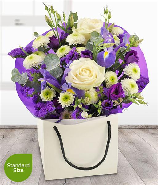 A pretty purple and white aqua pack bouquet featuring delicate white Roses and Spray Chrysanthemums with purple Lisianthus, Statis and Irises.
