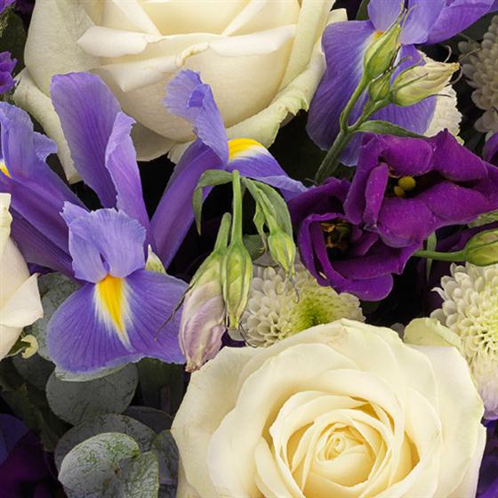 White Rose, Purple Lisianthus, Purple Statis, Blue Iris, White Spray Chrysanthemum, Eucalyptus.