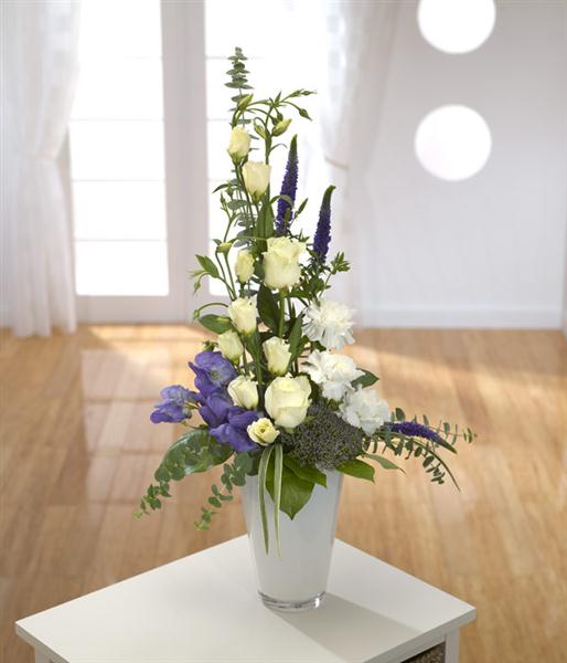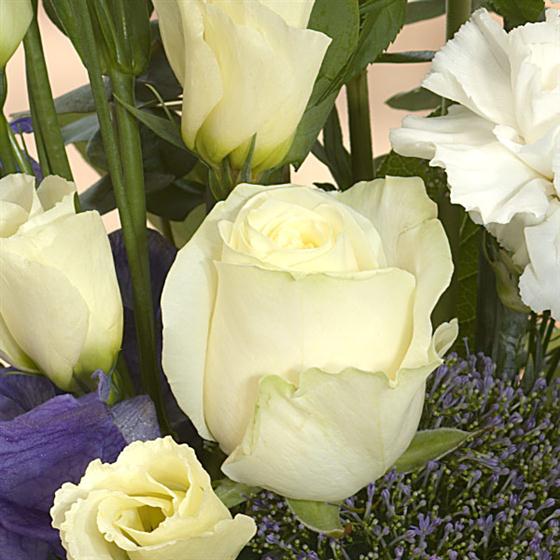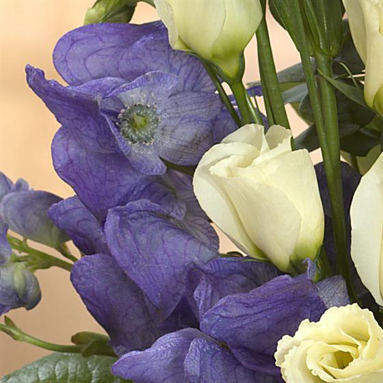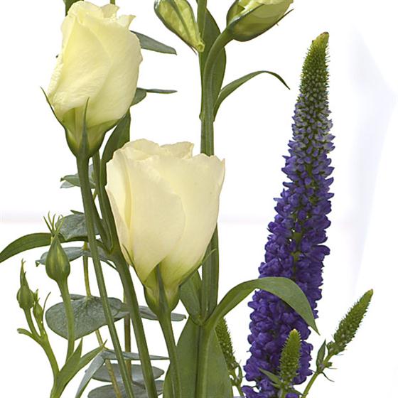 A striking arrangement of white Roses and cream Lisianthus with Veronica, Trachelium and Aconitum providing a touch of blue.