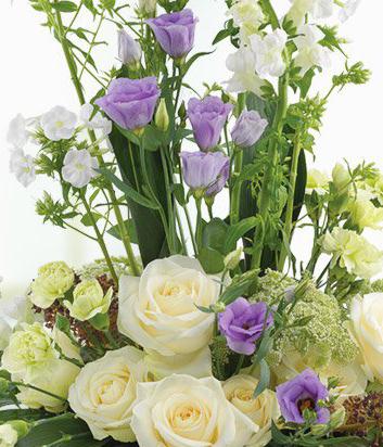 The lilac Lisianthus at the centre of this exquisite arrangement sit perfectly alongside the pure white Roses, Antirrhinums, Phlox, Ammi and Spray Carnations. An eye catching aromatic display.