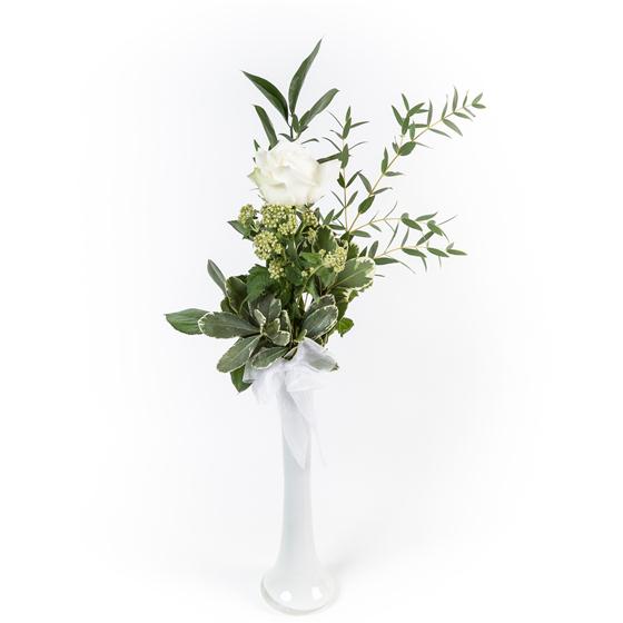 A single long stemmed white rose presented in a vase with mixed foliage sends a simple message.