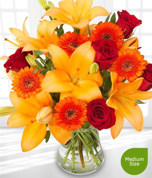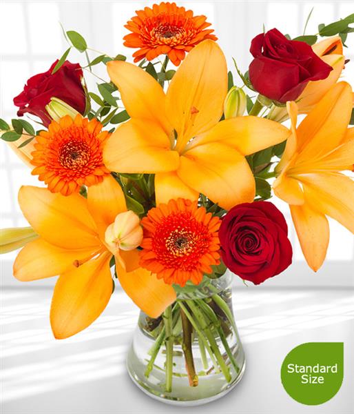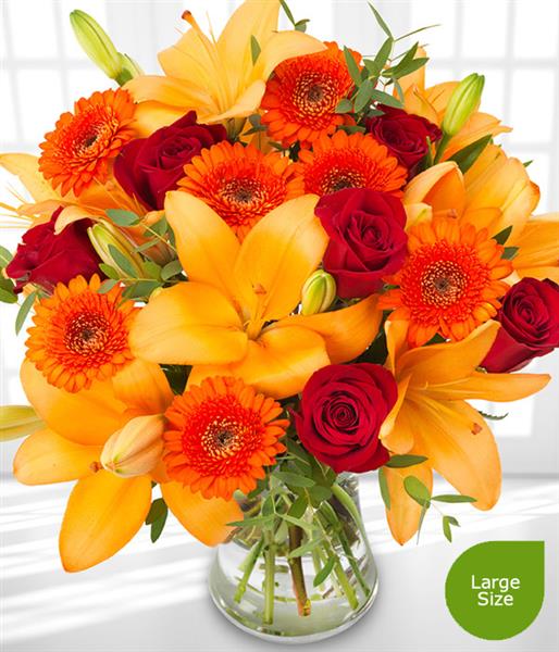A simply bold bouquet of the finest and freshest orange germini, red roses and orange lilies topped with eucalyptus.