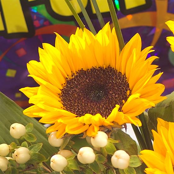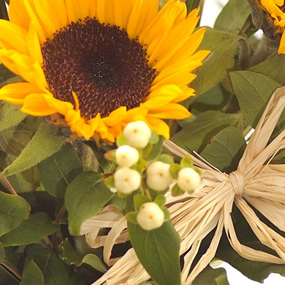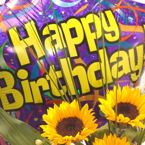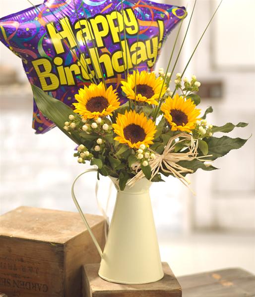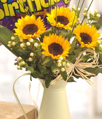 A lovely gift to represent a sunny afternoon. A cream jug filled with Sunflowers, Hypericum berries and foliage finished with a raffia bow. Delivered with a balloon to make the perfect Birthday gift.
