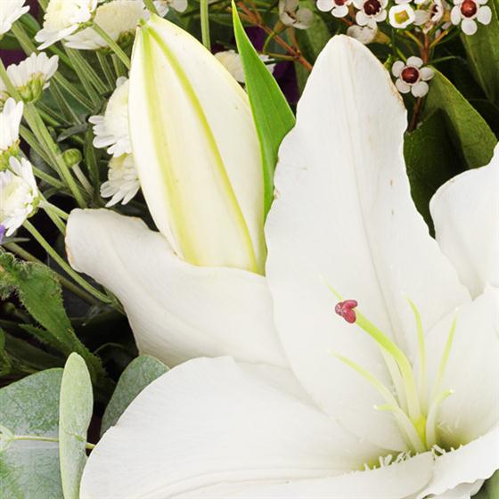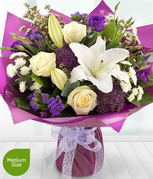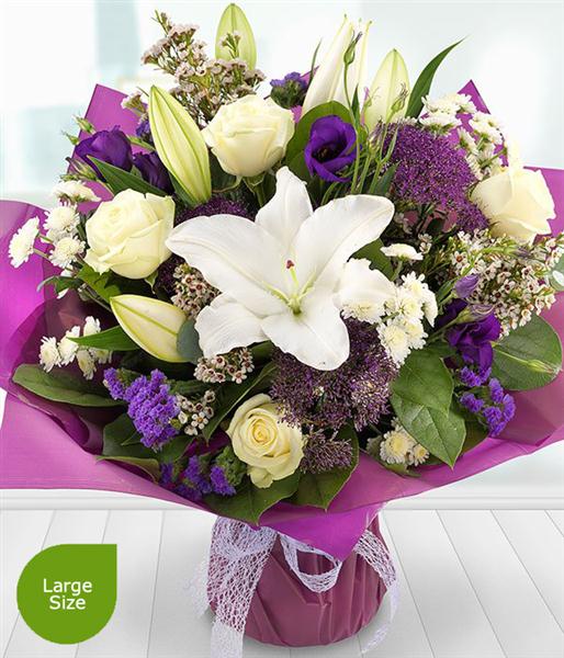 A sophisticated arrangement of crisp, white Lilies, Roses and Wax Flowers married with simply sumptuous purple Lisianthus and Statis blooms, finished with a dash of Eucalyptus and Salal.