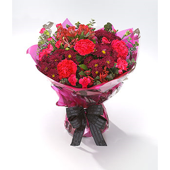 A bold hand-tied aqua-pack bursting with deep red Chrysanthemums and Carnations. A perfect gift for someone 'I Think of You Always'
