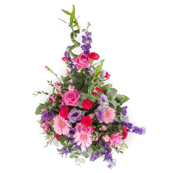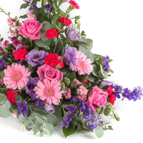 A beautiful, front facing arrangement in bright pinks, striking purples and lilacs.