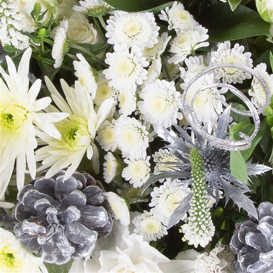 A stylish bouquet of all white blooms, including roses and carnations intermingled with silver eryngium and eucalyptus.