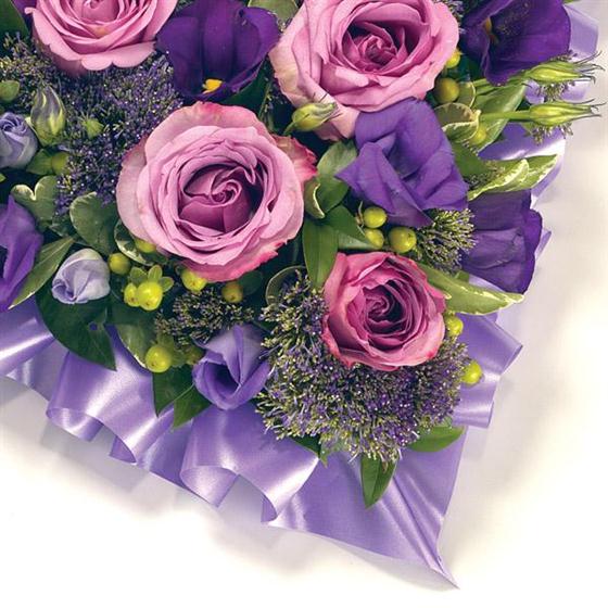 A beautiful pink & white coloured heart shaped tribute, featuring Roses, Eustoma, Chrysanthemums, fragranced Freesias and complementary foliage with a ribbon edge. Size: Height - 33cm (13") Length - 33cm (13").