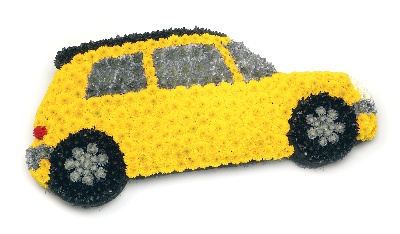 Based Chrysanthemum wreath in the shape of a motor car. Size: Height - 36cm (14") Width - 78cm (30").