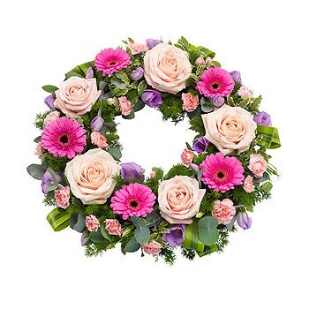 A pretty pink wreath featuring Roses, Germini and Carnations with lilac Lisianthus and mix of luscious green foliage.