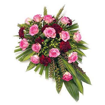 A beautiful single ended spray of pink roses & red carnations combined with variegated foliage and Palm Leaves. Size: 53cm (21").