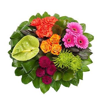 A stunning vibrant posy pad. An orange Rose, cerise Germini, green and purple Chrysanthmums, orange Carnations and red Cordyline on a bed of green foliage.