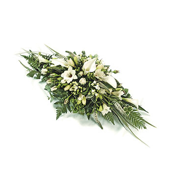 Childs spray with white calla lilies and freesia and spray roses with complementary foliage. Size: Width - 61cm (24").